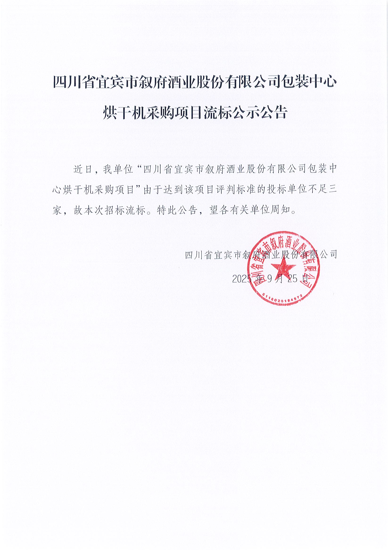 四川省宜賓市敘府酒業(yè)股份有限公司包裝中心烘干機(jī)采購項目流標(biāo)公示公告