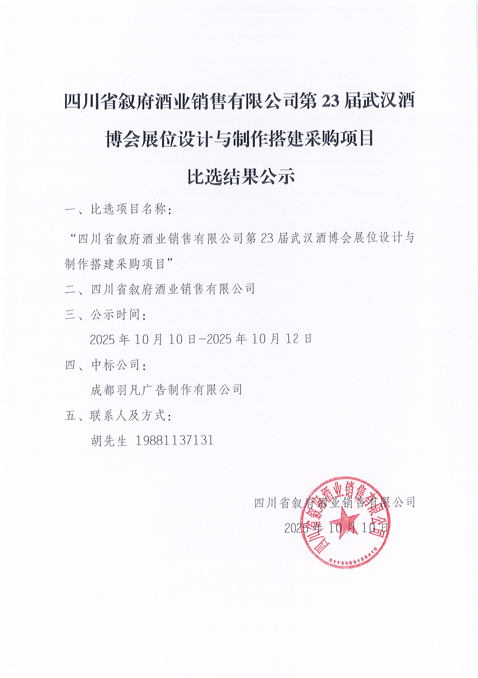 四川省敘府酒業(yè)銷(xiāo)售有限公司敘府大曲(藍(lán)標(biāo))產(chǎn)品TVC的創(chuàng)作與拍攝采購(gòu)項(xiàng)目中標(biāo)結(jié)果公示公告
